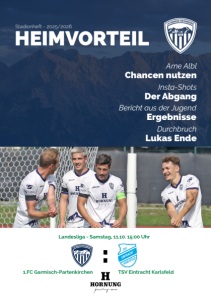 HEIMVORTEIL Stadionheft - 2025/2026 Landesliga - Samstag, 11.10. 15:00 Uhr 1.FC Garmisch-Partenkirchen TSV Eintracht Karlsfeld : Bericht aus der Jugend Ergebnisse Insta-Shots Der Abgang Arne Albl Chancen nutzen Durchbruch Lukas Ende